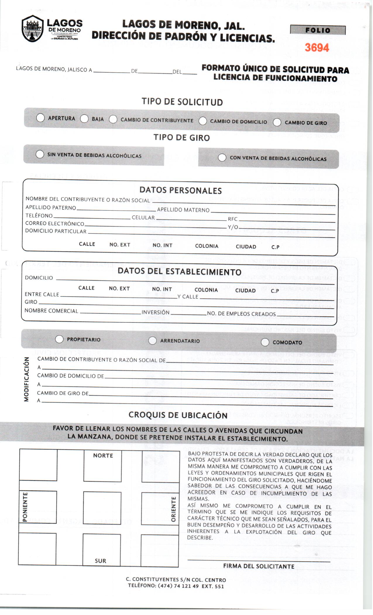 SOLICITUD DE PERMISO PARA LA EXPLOTACIÓN DE VENTA DE BEBIDAS ALCOHÓLICA.